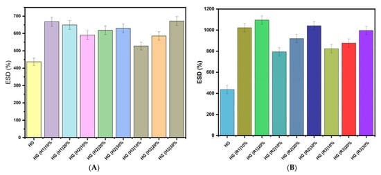 The equilibrium swelling degree (ESD) measurements in distilled water at room temperature are presented in Figure 8 for all studied samples. The equilibrium water content of the PEGDA hydrogels increased with the presence of the LDH filler (Figure 8A). This increase was more pronounced after immobilization of RfL phytoextract in the LDHs matrix (Figure 8B). The increase in water absorption as a result of RfL phytoextract immobilization in the LDHs particles and incorporation in the hydrogel structures is attributed to the presence of the phenolic compounds that limits the chain propagation (phenols might act as a chain transfer agent) []. The results show that a higher LDHs content in the polymer network leads to higher ESD of the HG composites. A possible explanation of this behaviour can be the intercalation of the LDH layers which led to a good dispersion in the polymer network and the yielding of more intercalate nanolayers increases the hydration ability of the OH group. A similar result was described by Lee and Chen in the case of poly (acrylic acid-co-n-isopropyl acrylamide)/intercalated hydrotalcite nanocomposites hydrogels [].