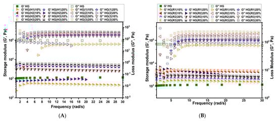 Viscoelastic properties determined through frequency sweep measurements for the composite HGs containing pristine LDH (A) and containing RfL phytoextract immobilized in the LDH matrix (B).