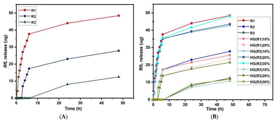 The results displayed in Figure 10 show the release rate of the RfL phytoextract at pH 6.8 for LDHsRfL and HGs with LDHsRfL samples. As one can see in the Figure 10A, the release rate of RfL phytoextract from LDHs not covered with HGs was higher for the R1 sample and smaller for the R2 and R3 samples, in the same time interval. In the case of R2 and R3, a delayed release is observed, showing the good encapsulation of phytoextract in LDH. Thus, the amount of released RfL depends on the composition of the LDH samples. Therefore, the RfL release was influenced by the interaction between immobilized RfL molecules and the bulk surface of LDH particles [].