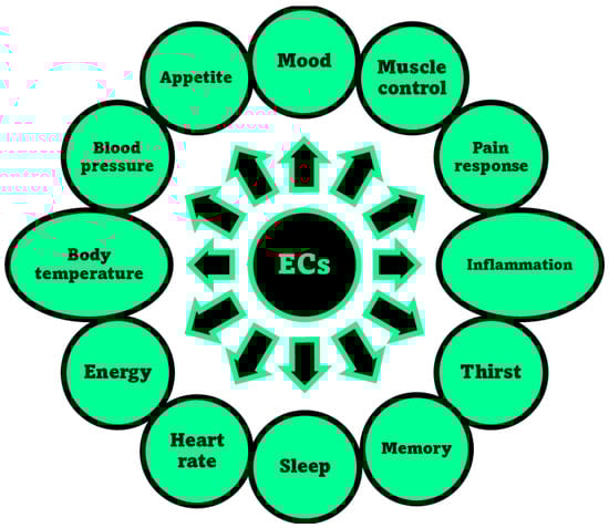 The activation of CB1 receptor or the concurrent activation of both receptors by ECs or PCs leads to both psychotropic, undesired effects and therapeutic outcomes. Exactly, while mind alteration, psychotropic effects, cardiovascular adverse events can occur, analgesic, sedative, antidepressant, anti-inflammatory, anti-anorexic, anti-emetic, anticancer and antibacterial desirable effects can also arise. As an example, the FDA-approved drug formulations containing the synthetic versions of Δ9-THC namely dronabinol (marketed as Marinol® or Syndros®) or nabilone (marketed as Cesamet™), as well as the extracted THC (marketed as Sativex®), possess affinity for both CB1 and CB2 [48]. Clinically, they are primarily used to treat the chemotherapy-induced nausea, to enhance appetite in cachexic AIDS-patients, and to alleviate the spasticity and pain associated with multiple sclerosis [30]. Unfortunately, evidence of undesired psychotropic and cardiovascular adverse effects strongly limits the therapeutic efficacy of such medicines [49]. Otherwise, the selective activation of CB2 receptors, occurring for example by CBG or CBD, could provide therapeutic effects, such as immuno-modulatory properties, anti-inflammatory, anti-emetic, and anti-anorexic effects without exerting the psychotropic actions deriving from the CB1 activation. In addition, the potent analgesic effects, associated with the activation of CB2, could be helpful in alleviating chronic widespread musculoskeletal pain (CWP) disorders, such as fibromyalgia syndrome [50]. Also, the selective activation of CB2 receptors could enhance severe human diseases as osteoporosis, atherosclerosis, cancer, chronic liver injuries and neurodegeneration [48]. Collectively, CB1 and CB2 receptors together with ECs make part of the so-called EC system (ECS), which was discovered in the 1990′s by scientists researching cannabinoids, which includes also several enzymes involved in producing and recycling ECs. In humans, ECs are naturally produced by cells within the body in response to external factors, like pain or temperature. As shown in Figure 3, among other molecules, ECs include the well-known compounds 2-arachidonoylglycerol (2-AG) and anandamide (ANA), as well as the less-known ECs like virodhamine, and 2-arachidonoyl glycerol ether [51]. Particularly 2-AG and ANA activate both CB1 and CB2 receptors with affinity for CB1 higher than that for CB2 [48]. Collectively, the interaction between ECs and their corresponding receptors is pivotal in maintaining the body’s internal balance or homeostasis. ECs regulate some very important aspects of human health, as depicted in Figure 4.