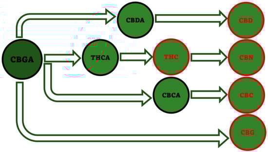 Figure 8. Biosynthetic pathway starting from CBGA and leading to the five major PCs. This image has been created by the authors exploiting information available online at https://www.openaccessgovernment.org/cbg-the-mother-of-all-cannabinoids-with-broad-antibacterial-activity/95824/ (accessed on 3 May 2023).
