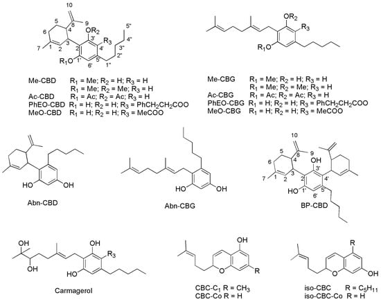 Since given their non-psychotropic profiles, CBD and CBG can be considered especially promising, Appendino et al. performed structure-activity studies. Among the various synthetic derivatives, only the synthetic abnormal cannabinoids Abn-CBD and abn-CBG, although slightly less potent than CBD and CBG, showed antibacterial activity comparable to that of their corresponding natural products [83].