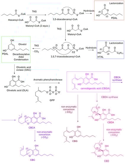 Briefly, the tetraketide synthase (TKS) catalyzed sequential condensation of hexanoyl-CoA with three molecules of malonyl-CoA yields 3,5,7-trioxododecaneoyl-CoA. By olivetolic acid cyclase (OAC), this compound cyclizes and aromatizes, through the loss of Coenzyme A, providing olivetolic acid (OLA) [13]. During these first steps, by hydrolytic processes and lactonization the side-products pentyl diacetic lactone (PDAL) (red square) and hexanoyl triacetic acid lactone (HTAL) (blue square) are also produced, while upon a decarboxylation TKS catalyzed, olivetol is formed (green square). Then, aromatic prenyltransferase inserts the prenyl group at the highly nucleophilic 2-resorcinol position to provide cannabigerolic acid (CBGA) [13]. Then, while CBGA provides CBG upon a non-enzymatic loss of CO2, through reactions catalyzed by the opportune synthases, it provides the cannabinolic acids CBDA, and CBCA, which in turn provide the de-carboxylate (−)-CBD and CBC, by non-enzymatic decarboxylation [13].