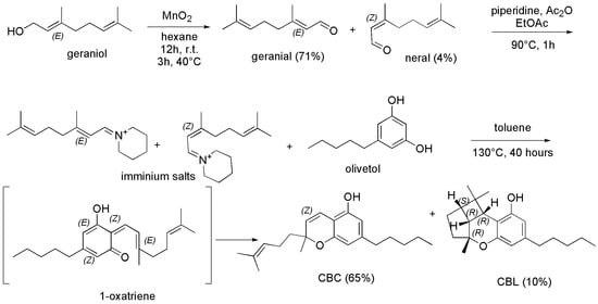 Briefly, E-geraniol dissolved in dry hexane was treated with manganese dioxide (MnO2) under magnetic stirring at room temperature for about 12 h and then heated at 40 °C for further 3 h, to provide citral as crude product, which was purified by silica gel chromatographic column obtaining the purified aldehydes (with a yield of 75%) as an E/Z mixture (E/Z 95/5, GC-MS) of geranial (E-citral, 71%) and neral (Z-citral, 4%). Subsequently, the prepared mixture was treated with Ac2O in EtOAc in the presence of piperidine and heated at 90 °C for 1 h, to give an iminium salt, which was added with a solution of olivetol in toluene and stirred at 130 °C for 40 h. Upon an oxa-annulation consisting of a Knoevenagel reaction providing the 1-oxatriene intermediate, followed by an oxa-electrocyclization, the crude CBC was obtained, which was then purified by chromatographic column. Pure CBC (yield 65%) and cannabicyclol (CBL, yield 10%) were finally isolated. Interestingly, Luo et al. [94], and Yeom et al. [96], who previously employed this procedure starting from a mixture of E/Z-citral, and from only geranial (E-citral) respectively, achieved CBC with a yield lower than Seccamani (50% vs. 65%). Similar procedures starting from E/Z-citral and olivetol were proposed in the same year (2021), by Schafroth, et al. [98] and by Anderson et al. [99], achieving CBC with yields of 50% and 35%, respectively. Particularly, the group of Schafroth evidenced that acidic or basic conditions were determinant to redirect the reaction towards the formation of CBC rather than towards that of Δ9-THC (Scheme 4).