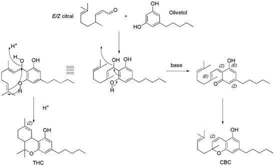 Scheme 4. Synthetic procedure to achieve either CBC in basic conditions or THC in acidic ones [98].