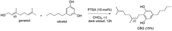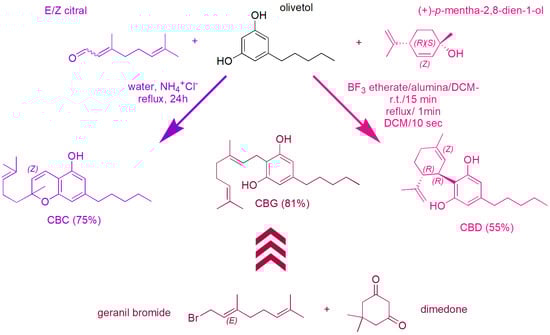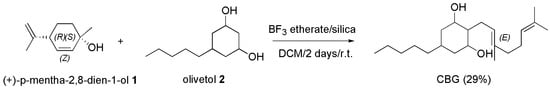 Differently and more specifically, Anderson et al. reacted olivetol and E/Z-citral in toluene using ethylenediamine diacetate as catalyst and heating the solution at reflux for 6 h (Scheme 5), as it was reported previously by Lee et al. [100], who prepared CBC with similar yield (40% vs. 35%).