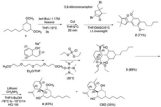 123. Vaillancourt, V.; Albizati, K.F. A One-Step Method for the.Alpha.-Arylation of Camphor. Synthesis of (−)-Cannabidiol and (−)-Cannabidiol Dimethyl Ether. J. Org. Chem. 1992, 57, 3627–3631. [Google Scholar] [CrossRef]