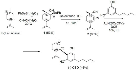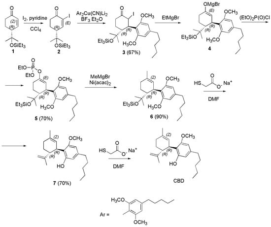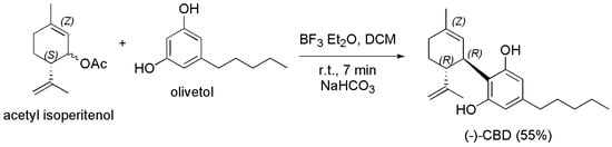 126. Kobayashi, Y.; Takeuchi, A.; Wang, Y.-G. Synthesis of Cannabidiols via Alkenylation of Cyclohexenyl Monoacetate. Org. Lett. 2006, 8, 2699–2702. [Google Scholar] [CrossRef] [PubMed]