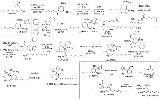 127. Shultz, Z.P.; Lawrence, G.A.; Jacobson, J.M.; Cruz, E.J.; Leahy, J.W. Enantioselective Total Synthesis of Cannabinoids—A Route for Analogue Development. Org. Lett. 2018, 20, 381–384. [Google Scholar] [CrossRef] [PubMed]