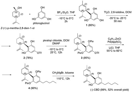 129. Chiurchiù, E.; Sampaolesi, S.; Allegrini, P.; Ciceri, D.; Ballini, R.; Palmieri, A. A Novel and Practical Continuous Flow Chemical Synthesis of Cannabidiol (CBD) and Its CBDV and CBDB Analogues. Eur. J. Org. Chem. 2021, 2021, 1286–1289. [Google Scholar] [CrossRef]