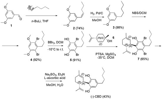 128. Gong, X.; Sun, C.; Abame, M.A.; Shi, W.; Xie, Y.; Xu, W.; Zhu, F.; Zhang, Y.; Shen, J.; Aisa, H.A. Synthesis of CBD and Its Derivatives Bearing Various C4′-Side Chains with a Late-Stage Diversification Method. J. Org. Chem. 2020, 85, 2704–2715. [Google Scholar] [CrossRef] [PubMed]