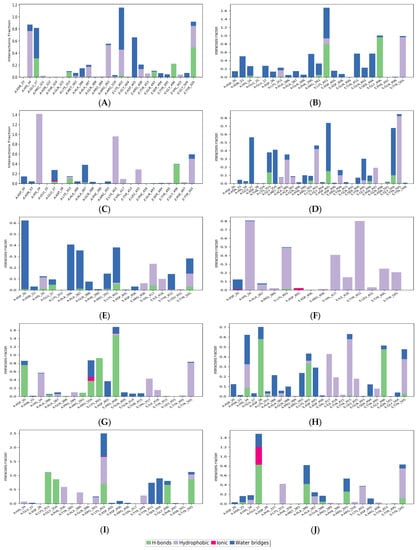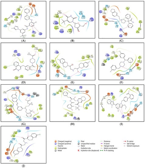 2D interactions of docked protein-drug complexes; (A) Nilotinib, (B) Viroptic, (C) Darifenacin, (D) Olaparib, (E) Nebivolol, (F) Meclizine, (G) Montelukast, (H) Nelfinavir, (I) Telmisartan, and (J) Lifitegrast.