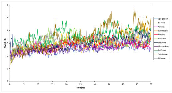 The ligand RMSD indicates the stability of the ligand with respect to the protein and its binding pocket. The ligand RMSD values for the selected drug molecules ranged between 2.77 and 5.86 Å (Table S1). Viroptic reported the lowest deviation, indicating higher stability at the active site compared to nelfinavir and lifitegrast which showed higher deviations. Interestingly, although the binding of telmisartan caused higher structural deviations in the alpha carbons of the protein, lower ligand RMSD indicates that the drug seems to be stable in its binding pocket.