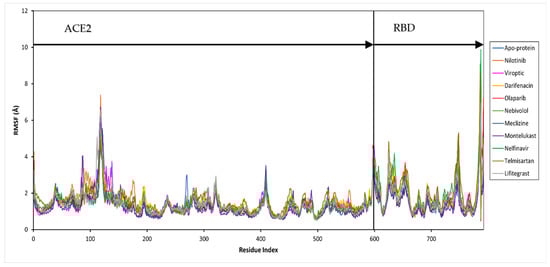 Per residue, root mean square fluctuation (RMSF) of the SARS-CoV-2 RBD-ACE2 complex (apo-protein) and inhibitor-bound complexes. The residues belonging to ACE2 and RBD are shown.