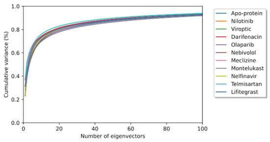 The cumulative contribution of the top 100 eigenvectors to the variance of the overall protein dynamics of the SARS-CoV-2 RBD-ACE2 complex (apo-protein) and protein-drug complexes in a 50 ns simulation trajectory.