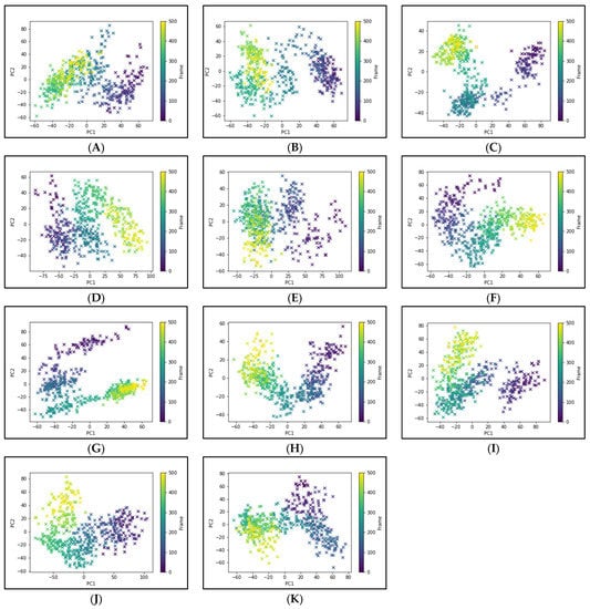 Principal component analysis of 50 ns MD trajectory of free and bound protein. (A) SARS-CoV-2 RBD-ACE2 complex (apoprotein), (B) Nilotinib, (C) Viroptic, (D) Darifenacin, (E) Olaparib, (F) Nebivolol, (G) Meclizine, (H) Montelukast, (I) Nelfinavir, (J) Telmisartan, and (K) Lifitegrast. The motion of alpha carbon atoms of protein is indicated by a color change from violet to green to yellow for the duration of the simulation trajectory.