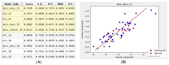 (A) Snapshot of report and performance parameters for top ten AutoQSAR models. (B) Correlation plot of Glide docking binding affinities and predicted binding affinities for the top-ranked kpls_desc_12 AutoQSAR model.
