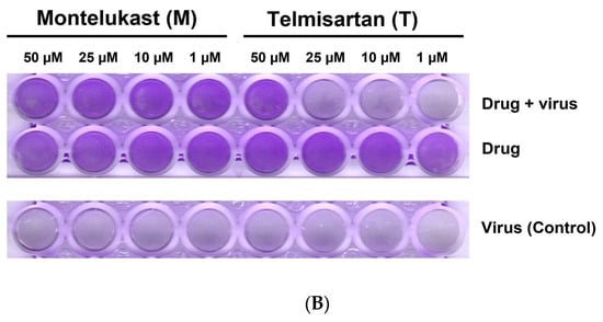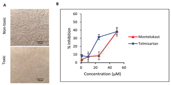(A) The representative images for the cell viability assay depicting toxic and non-toxic effects on Vero cells were taken after 48 h (duration of the antiviral assay) at 20× magnification captured using. (B) Inhibition of SARS-CoV-2 in Vero cells when incubated with montelukast and telmisartan. Results are shown as mean ± SEM (n = 3).