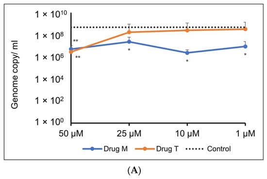 First, the cytotoxic effect of M and T was evaluated. Different dilutions of compounds were incubated on Vero cells and cells were observed for morphological changes at 24, 48, and 72 h. For M, toxicity was visible at 100 µM concentration and slight cell clearance at 75 µM after 24 h. On the contrary, cells were healthy at 24 h for all concentrations of T and showed early signs of cell stress at 48 h for 100 and 75 µM. Minimal toxicity or cell stress was observed for concentrations of M and T below 50 µM for up to 48 h (duration of the antiviral plaque assay), hence those concentration ranges were tested against the virus. The representative data for the cell viability assay (Figure 9A) depicting toxic and non-toxic effects on Vero cells are shown in the images taken at 20× magnification after 48 h. The cell viability for M and T in Vero cells using MTT assay is shown in Figure S3. This data is consistent with previously published cell viability data in Vero cells for M [19] and T [45].