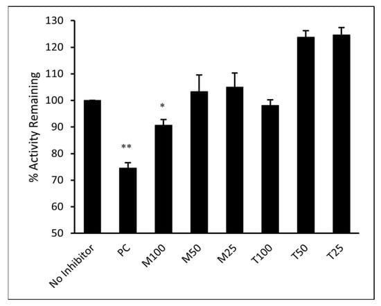 Dilutions of M and T were prepared in M199 cell culture media and mixed 1:1 with SARS-CoV-2 (SARS-CoV-2, 2019-nCoV/USA-IL1/2020) and incubated at 37 °C for 1 h. Viral work dilution contained 80 plaque-forming units per well, prepared from 2.1 × 106 PFU/mL viral stock (multiplicity of infection; MOI = 0.00016). A final DMSO concentration of 0.5% was maintained for all mixtures. Following incubation, the mixtures were added to Vero cell 6-well plates in triplicate and incubated for 1 h at 37 °C. After incubation, a 0.5% agarose overlay solution was added to cell monolayers of each well. After 24 h, a secondary 0.5% agarose overlay solution containing neutral red was added to each well. After another 24 h, viral plaques of wells inoculated with dilutions of M and T were counted and compared to the number of plaques observed in the virus-only controls, which were diluted in M199 with 0.5% DMSO. Two virus-free negative controls containing M199 and M199 with 0.5% DMSO. The percent inhibition values were calculated using Equation (3).