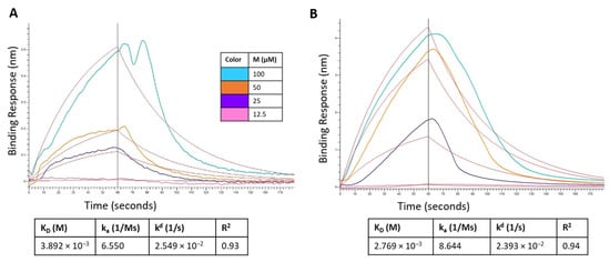 The binding kinetics of M and T analytes on SARS-CoV-2 RBD protein were studied using an Octet® R4 system (Sartorius Corporation, Bohemia, NY, USA). Experiments were conducted at 30 °C and a buffer system consisting of 10 mM phosphate buffer, pH 7.4, 137 mM NaCl, 2.7 mM KCl, 0.01% BSA, 0.002% Tween 20, and 0.5% anhydrous dimethyl sulfoxide (DMSO) was used. Recombinant his-tagged SARS-CoV-2 RBD protein wild-type (40592-V08H, Sino Biological US Inc., Wayne, PA, USA) and RBD Omicron variant (40592-V08H129, Sino Biological US Inc., Wayne, PA, USA) at a concentration of 5 μg/mL was loaded on HIS1K biosensors (Sartorius Corporation, Bohemia, NY, USA) for 300 s, followed by a baseline step. The association and dissociation profiles of the analytes were measured at various concentrations. A reference sample was used for baseline correction using a biosensor loaded in the same manner with 0 μM M and T. Reference biosensors were used for each concentration of the analyte without RBD loading. The final binding curves were analyzed with the Octet Analysis Studio Software (Sartorius Corporation, Bohemia, NY, USA) using the 1:1 global-fitting model.