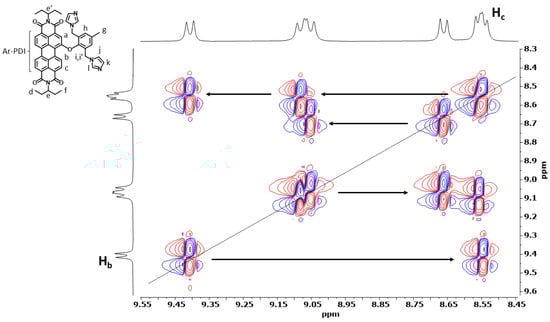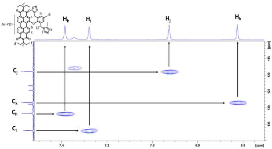 The singlet located at 7.39 was assigned to Hh because it shows two cross peaks in the COSY spectrum with Hg and Hi. COSY spectrum of PDI-3 shows that all imidazole protons are coupled to each other. Hi, Hj, and Hk could be assigned thanks to the HSQC experiment taking as reference assigned carbon spectra obtained in a database [] and a recent publication []. Thus, the chemical shifts of Cl, Ck, and Cj were assigned to the signals of 136.9, 128.3, and 118.8 ppm, respectively. These signals have a cross peak with the signals at 7.28 (Hl), 6.93 (Hk), and 6.63 (Hj) ppm (Figure 2).