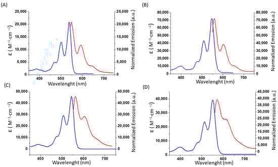 Absorption (blue line) and normalized emission spectra (red line) of: (A) PDI-3, (B) PDI-4, (C) PDI-1, and (D) PDI-2.