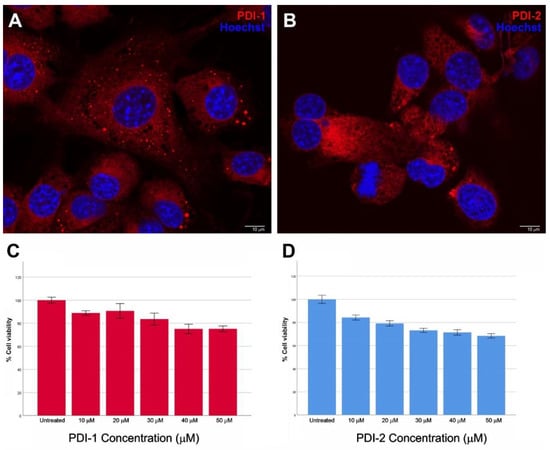 MTT assay was performed without specific irradiation, under dark conditions, to evaluate the cytotoxicity of the synthesized compounds as well as to investigate the inherent cytotoxic potential of the compounds without the influence of photodynamic effects. Variable concentrations of each PDI were used to evaluate their impact on cell viability. The degree of cytotoxicity was determined by comparing the concentration of PDIs to that of untreated control cells (Figure 5). Cell viability remained above 80% with concentrations up to 30 µM for PDI-1 (Figure 5C). Similarly, viability remained over 70% with concentrations up to 40 µM of PDI-2 (Figure 5D). The concentration 10 µM was chosen to perform the phototoxicity assay, and the IC50 values obtained for PDI-1 and PDI-2 were 386.87 μM and 656.19 μM, respectively. Therefore, the concentration used for photostimulation was in the safe range as the IC50 values obtained were quite far from this concentration.