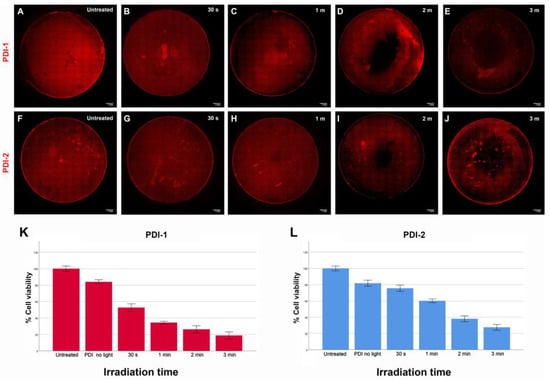 Phototoxicity induced by PDIs in HeLa cell line. Effect of increasing time exposure using 547 nm light at 35 mW/cm2 irradiance from 30 s to 3 min in cells treated with 10 μM of PDI-1 (A–E) or PDI-2 (F–J). (K,L) Viability percentage of cells treated during 24 h with PDIs and exposure to light irradiation (547 nm) for 30 s, 1 min, 2 min, and 3 min, respectively. Untreated cells (control, 100% of viability) were neither exposed to PDIs nor irradiated. Cells “PDI no light” were incubated with PDIs without specific irradiation. Data are represented as mean ± SD of independent experiments (n = 4). Scale bar: 1 mm.