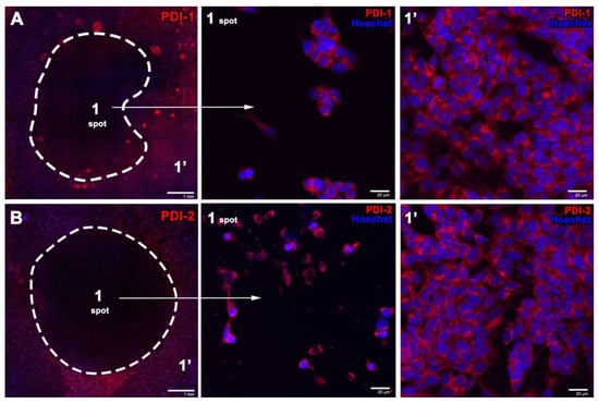 A more detailed study was also carried out by confocal microscopy on the effect of phototherapy with PDI-1 and PDI-2 exposed for 2 min to 547 nm light. As demonstrated in Figure 7, PDI-induced phototoxicity in the irradiated zone (1 spot) caused widespread cell death; moreover, the surviving cells showed abnormal cell morphology suggesting a considerable affectation of PDT on these tumor cells. However, no changes in morphology or cell density were detected in the non-irradiated area (1′) within the same coverslip.