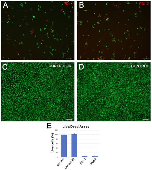 Fluorescence images of the live/dead assay were obtained after subjecting the cells to 3 min of irradiation (light dose of 35 mW/cm2). Cells were treated with 10 μM of PDI-1 (Figure 8A) or PDI-2 (Figure 8B). The harmful effect of irradiation on cells treated with PDI-1 and PDI-2 is evident, as it results in a drastic reduction in live cells (4.6 ± 0.9% and 5.42 ± 0.78%, respectively). However, control cells that were not treated with PDIs, both the irradiated ones (Figure 8C) and the non-irradiated ones (Figure 8D), show a survival rate close to 100% of viable cells (Figure 8E).