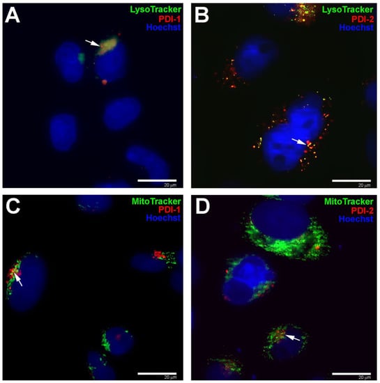 In order to investigate the uptake and localization of PDIs, cells were incubated with either MitoTracker Green (Thermo Fisher Scientific, Waltham, MA, USA) or Lysotracker Green (Thermo Fisher Scientific, Waltham, MA, USA) for 30 min. Cell nuclei were stained with Hoechst 33342 (Thermo-Fisher Scientific, Waltham, MA, USA). Fluorescence microscopy (Apotome Zeiss) was used to analyze Mitotracker’s and Lysotracker’s subcellular localization in mitochondria and lysosomes, respectively.