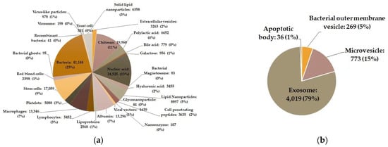 As one specific type of bioinspired DDSs, membrane vesicles have a membranous structure derived from natural cells. Several types of membrane vesicles have been reported including well-known extracellular vesicles (EVs) released from eukaryotic cells, outer membrane vesicles (OMVs) from bacteria, cell-bound membrane vesicles (CBMVs) isolated in situ from cell surfaces [3,4,5], membrane vesicles reorganized after the isolation of the plasma membrane of cells, etc. Extracellular vesicles are generally divided into three categories: exosomes, microvesicles or microparticles, and apoptotic bodies among which the research on exosomes predominates in the research field of extracellular vesicles (Figure 1b). The bearing of some specific molecules, which originally exists on/in the source cells enables membrane vesicles to have specific functions (e.g., making the target cells have some properties of the source cells). In recent decade, membrane vesicles, particularly extracellular vesicles and bacterial outer membrane vesicles, have been rapidly developed as inspired DDSs (Figure 2 displays the EV-/OMV-related publications by year). In the Special Issue “Advances of membrane vesicles in drug delivery systems” of the Journal Pharmaceutics which belongs to the section “Drug Delivery and Controlled Release”, 25 papers on the recent advances in membrane vesicle-based drug delivery systems have been collected and arranged in this Editorial article in the following order: the source, preparation, modification, drug loading, and in vivo administration and biodistribution of membrane vesicles (mainly extracellular vesicles or exosomes and bacterial outer membrane vesicles), as well as application of membrane vesicles as DDSs in the treatment of various diseases.