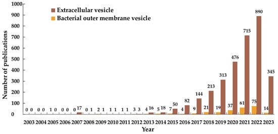 Publications by year of extracellular vesicles (EVs) and bacterial outer membrane vesicles (OMVs). The data were obtained from the Web of Science database by searching for article title or the abstract field using the following keywords: ‘Drug delivery’ or ‘drug carrier’ and ‘the name of a drug delivery system’ (the timespan is from 1 January 2003 to 18 June 2023).