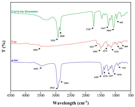 FTIR spectroscopy was used to study the interaction between cur, α-toc, and the bicosomes (Figure 2). The characteristic peaks of cur can be found at 3503 cm−1, a representative peak of the phenolic O–H group stretching vibrations. The peaks at 1627 and 1501 cm−1 are associated with the C=O and vibration of the benzene ring stretching respectively. The absorption peaks at 1271 and 1153 cm−1 are associated with aromatic C=O stretching and C–O–C group. The region between 959 and 809 cm−1 showed the cis and trans C–H deformation vibration on the benzene ring. In the cur spectrum, there were no peaks in the most significant carbonyl region (1800–1650 cm−1), indicating that cur existed in the keto-enol tautomeric form [].