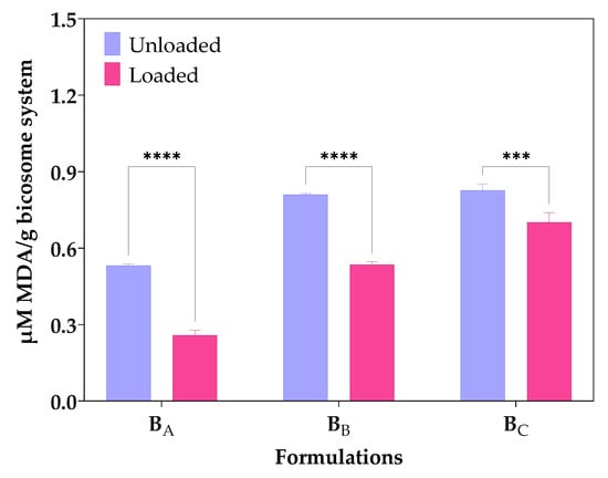 Lipid oxidation expressed as concentrations of malondialdehyde (µM/g MDA) formed by the breakdown of fatty acids of bicosome (BA, BB, and BC) loaded and unloaded with cur/α-toc. Statistical analyses of two-way ANOVA, Bonferroni, and multiple comparisons: **** = p < 0.0001, *** = p < 0.001 (n = 3).