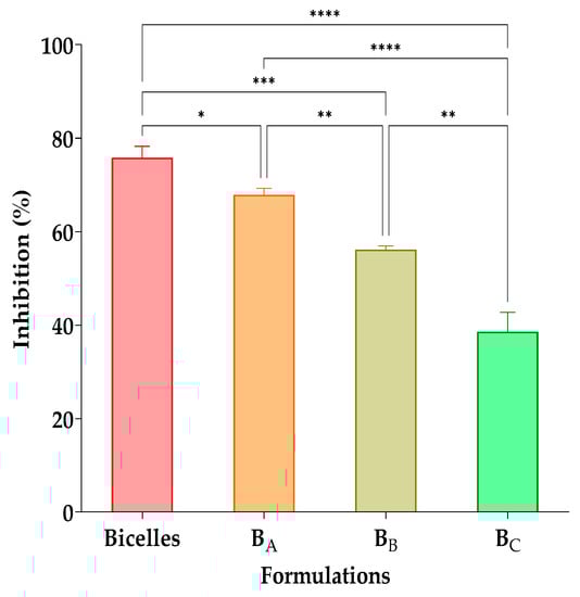 To evaluate the antioxidant effect of the cur and α-toc, a DPPH assay was performed. DPPH is a stable free radical that can be used to measure the radical scavenging activity of antioxidants. The reduction of the DPPH radical by radical scavengers is evaluated spectrophotometrically by monitoring the decrease in absorbance at 517 nm, as the DPPH radical is decolorized from deep violet to pale yellow []. The test was performed by comparing unloaded bicelles, cur/α-toc-bicelles, unloaded bicosomes, and the cur/α-toc-bicosomes (BA, BB, and BC). In addition, the equivalent concentration of the cur, α-toc, and cur and α-toc mixture used in the formulations was evaluated. Figure 4 shows the results of the antioxidant effect.