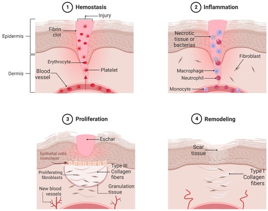 The wound healing process is a natural physiological reaction to tissue injury that consists of four highly integrated phases: hemostasis, inflammation, proliferation, and remodeling (Figure 1). These phases must occur in a specific sequence, at a specific time, and for a particular duration, in order that the physiologically involved functions fulfill their expected role [14]. Otherwise, this leads to improper or impaired tissue repair [15].
