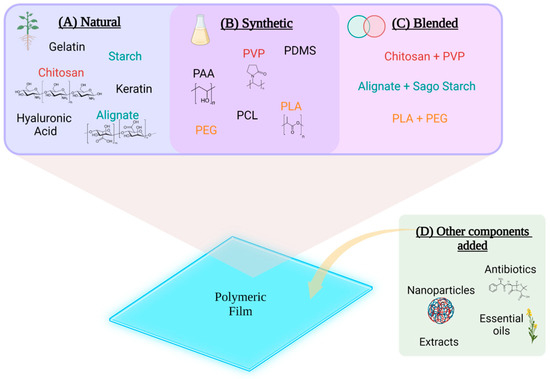 Composition of polymeric films. Examples of some polymers that may be used to form polymeric films. (A) Natural polymers; (B) synthetic polymers; (C) brief examples of blended polymers; (D) other components that can be added to enhance PFs’ characteristics.