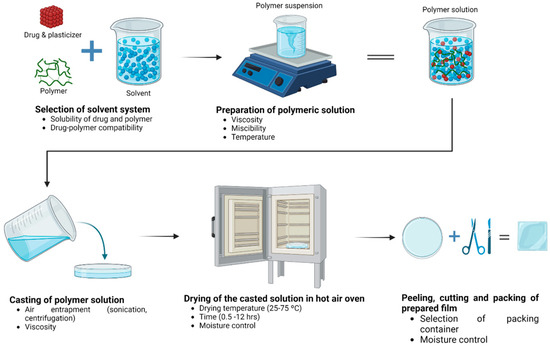 Solvent casting method for film production with quality control parameters. The process begins with selecting the polymer and solvent to prepare the polymeric solution, which is then poured into a mold. The mold is left to dry in an oven, and finally, the film is peeled, cut, and packaged.