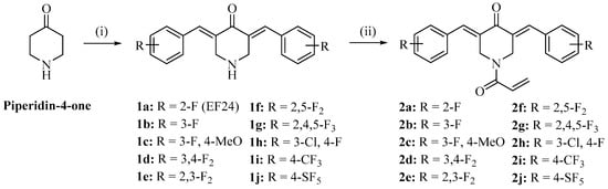 - Dimmock, J.R.; Padmanilayam, M.P.; Puthucode, R.N.; Nazarali, A.J.; Motaganahalli, N.L.; Zello, G.A.; Quail, J.W.; Oloo, E.O.; Kraatz, H.-B.; Prisciak, J.S.; et al. A conformational and structure-activity relationship study of cytotoxic 3,5-bis(arylidene)-4-piperidones and related N-acryloyl analogues. J. Med. Chem. 2001, 44, 586–593. [Google Scholar] [CrossRef] [PubMed]