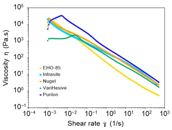 VariHesive showed the lowest viscosity at rest (low shear rate). EHO-85 had similar behavior to Nu-gel and Intrasite at a low shear rate, showing viscosities at 0.01 s−1 of 3512, 2702, and 3877 Pa·s, respectively. However, EHO-85 viscosity considerably decreased when increasing shear (shear thinning behavior), in comparison to other samples. EHO-85 had the lowest viscosity at a high shear rate, above 0.1 s−1 (Figure 1 and Table 1). Therefore, although shear thinning occurred in all samples, EHO-85 exhibited the most pronounced behavior.