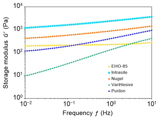 Elastic modulus (G′) of EHO-85, Intrasite, Nu-gel, VariHesive, and Purilon samples, as a function of oscillation frequency at constant strain.