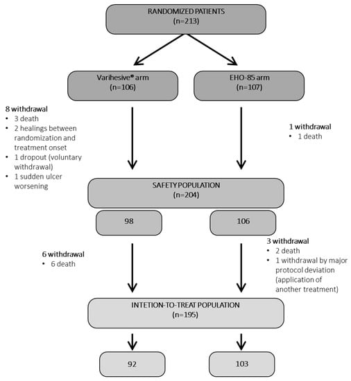 A total of 213 patients from 23 health centers were included in the pivotal RCT. They were randomized to receive either the EHO-85 amorphous hydrogel (n = 107) or the positive control VariHesive® (n = 106). Eighteen could not be included in the ITT analyses: Four in the EHO-85 group and fourteen in the VariHesive group (Figure 3). Therefore, 195 patients (92%) comprised the ITT studied populations: EHO-85 amorphous hydrogel (n = 92) vs. VariHesive control (n = 103).