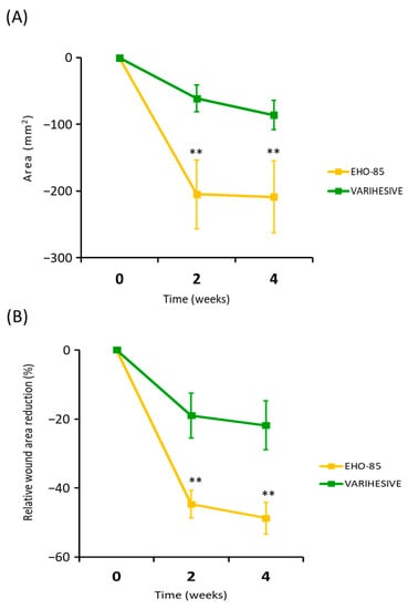 Evolution of the reduction of the ulcer area in both treatment groups during the 28 days of follow-up. (A) Absolute WAR. (B) Relative WAR evolution ITT analysis. Results are expressed as mean ± SD. ** p < 0.01 for the comparison of EHO-85 vs. VariHesive® after the second and fourth weeks of treatment. Significant and continued improvements in the WAR from the first days of application show EHO-85 acts as a trigger for the healing process.