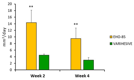 Daily ulcer reduction in the two treatment groups, in weeks 2 and 4, expressed in mm2. ITT population. Results are shown as mean ± Standard Error of the Mean (SEM). ** p < 0.01 for EHO-85 vs. VariHesive after the second and fourth weeks of treatment.