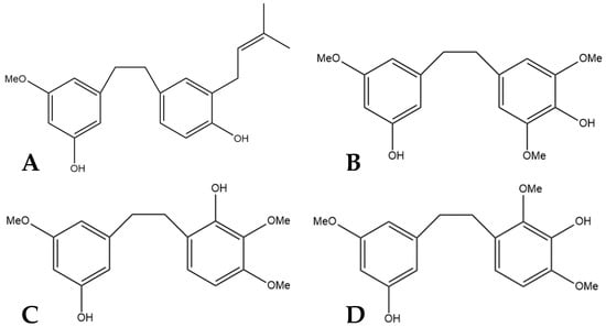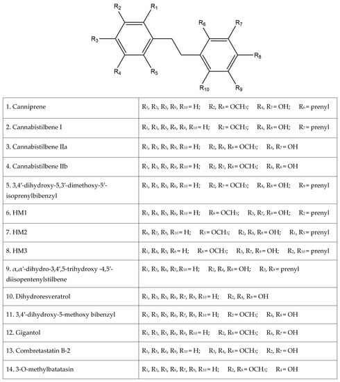 α,α′-dihydro-3′,4,5′-trihydroxy-4′-methoxy-3-isopentenylstilbene (HM1), α,α′-dihy- dro-3,4′,5-trihydroxy-4-methoxy-2,6-diisopentenylstilbene (HM2),and α,α′-dihydro-3′, 4,5′-trihydroxy-4′-methoxy-2′,3-diisopentenylstilbene (HM3) (Figure 6) were first identified by Guo et al. [16]. The authors determined the structures of these three compounds using LC-MS, H-NMR, C-NMR, and IR spectra. The three novel dihydrostilbenes were isolated and extracted from the leaves of a strain of cannabis from the Yunnan province of China.