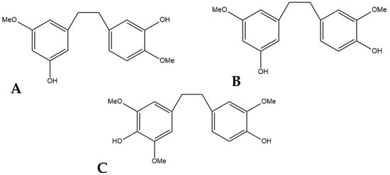 (A) 3,3′-dihydroxy-5,4′-dimethoxy bibenzyl (MW 274.32), the stilbene named gigantol found in cannabis. (B) 3,4′-dihydroxy-5,5′-dimethoxy bibenzyl, a common positional isomer of gigantol found in orchids. (C) 4,4′-dihydroxy-3,3′,5-trimethoxy bibenzyl, also occasionally referred to as gigantol.