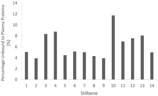 Understanding and predicting pharmacokinetic properties of these compounds is beneficial to the future pharmaceutical development of these products. Table 4 summarizes relevant pharmacokinetic data for the fourteen cannabis-derived stilbenes using predictive modeling of a 10 mg immediate-release tablet and human liver microsomal clearance. The predictive data reveal high percentage absorption (>90%) for ten of the stilbenes and suggest potential bioavailability (>50%) for eight of the stilbenes. Predictive modeling can also provide information regarding the plasma concentration, the area under the concentration-time curve, clearance, half-life, and volume of distribution, as summarized in Table 4.