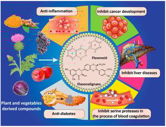 Flavonolignans are regarded as a small subgroup of polyphenols first found in silymarin (SLM), the seed extract of the Silybum marianum, which contains different flavonolignans, silychristin (SCN), silybin (SBN), silydianin (SDN), and isosilybin (ISBN) []. Typically, flavonolignan is utilized to treat liver diseases including alcoholic liver diseases, hepatitis, and liver cirrhosis [,,]. Other applications of the flavonolignan family include but are not limited to anti-inflammatory, anti-cancer, immunomodulating, antioxidant and, antifibrotic compounds, as well as ameliorating chemotherapy side effects (Figure 1) [,].
